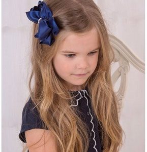 Navy double satin bow with a rhinestone button on a alligator clip.
