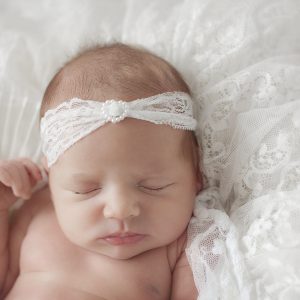 Beautiful grosgrain bow decorated with rhinestone on soft ivory lace. Available in various colours
