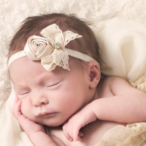 Vintage champagne satin rose with beautiful lace bow finished with gold cased diamante on a soft elastic headband