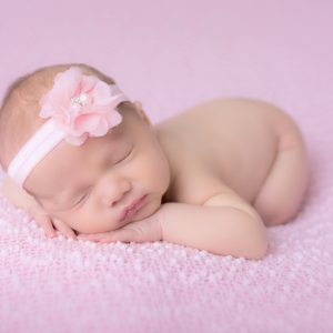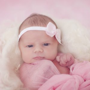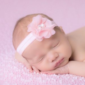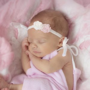 Beautiful dusky pink satin flower decorated with pearl on a delicate lace headband
