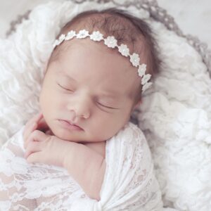 Three off white lace bows decorated with pearl and stones a soft elastic headband