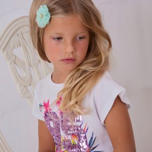 Mint and gold tulle glitter flower with rhinestone on a alligator clip.