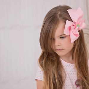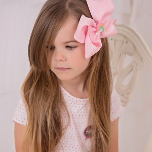 Oversized 6’’ grosgrain bow with rainbow button and Swarovski crystal on an alligator clip.