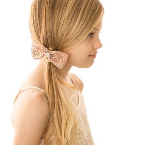 Large gold shimmer and satin bow with rhinestone on an alligator clip.