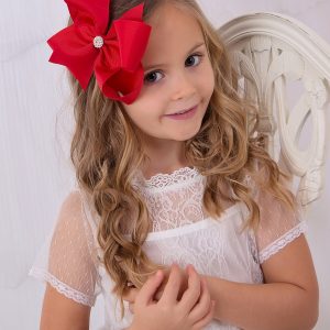 Oversized 6’’ grosgrain bow with rhinestone button on an alligator clip.