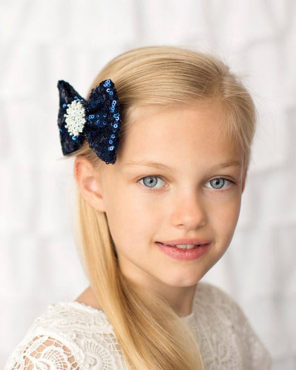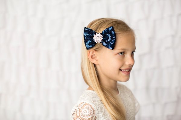 Navy sequin bow decorated with rhinestone on a clip