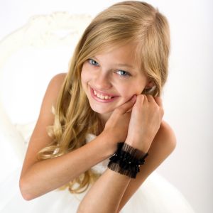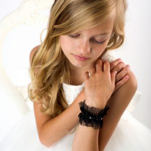 Black chiffon and tulle trim with Swarovski crystals and pearls on satin ribbon