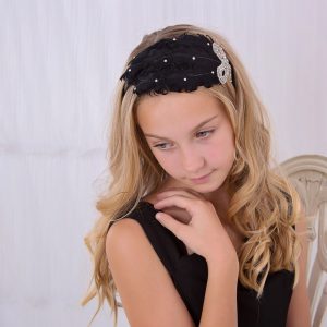Beautiful white marabou feather with scattered Swarovski crystals finished with grey and champagne satin roses and a beautiful diamante on a soft elastic headband