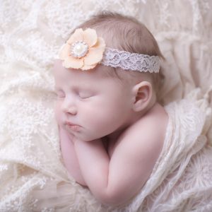 Peach flower with pearl and rhinestone button on soft lace headband