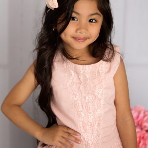 Peach lace bow with pearl button on soft velvet elastic headband
