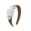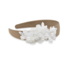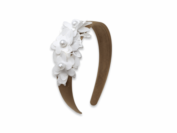 Brown wide alice band with off white flowers and pearls.