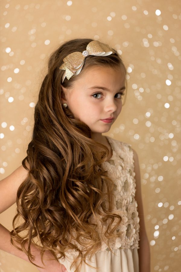 Fine gold glitter bow decorated with rhinestone on a satin alice band