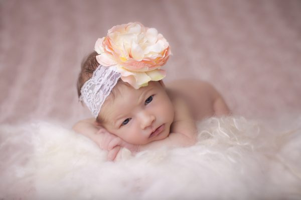 Gorgeous peach flower decorated with pearl and rhinestone button on soft elastic lace