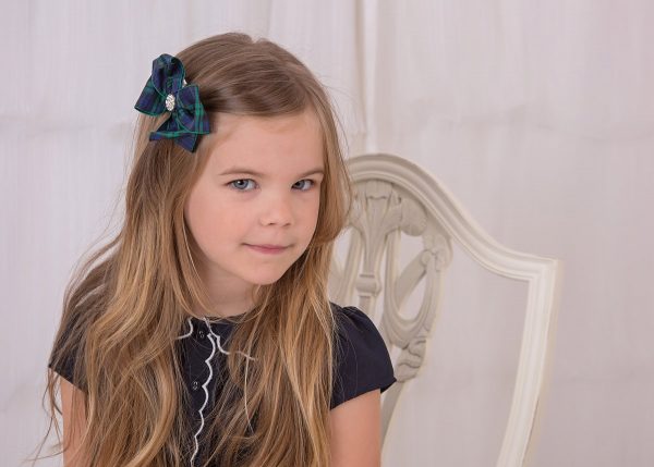 Large double navy and green gingham bow with rhinestone button on an alligator clip.