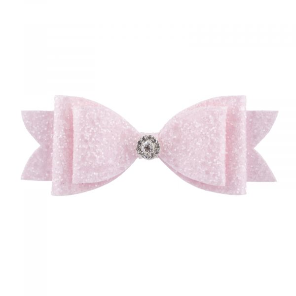 Large light pink glitter bow with rhinestone on a clip.