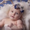 Navy oversized bow with gold lace and pearls on a soft elastic headband.