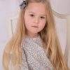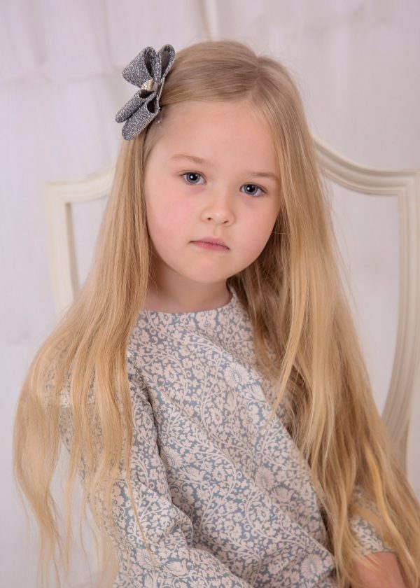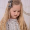 Shimmery grey layered bow with long rhinestone button on an alligator clip.