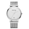 Silver watch with a silver face and stainless steel mesh bracelet.
