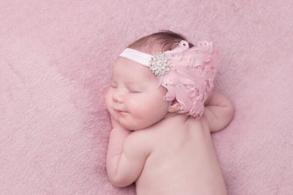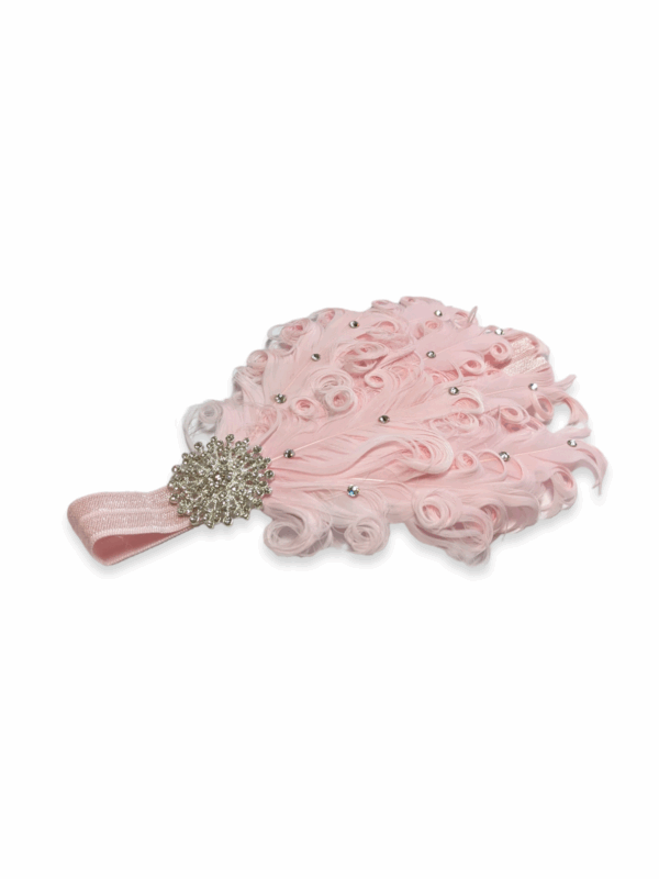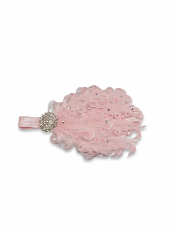 Vintage baby pink goose feather headband decorated with Swarovski crystals and beautiful diamante on a soft elastic headband