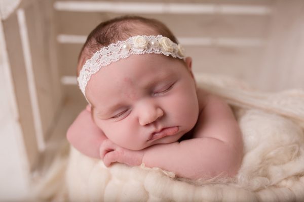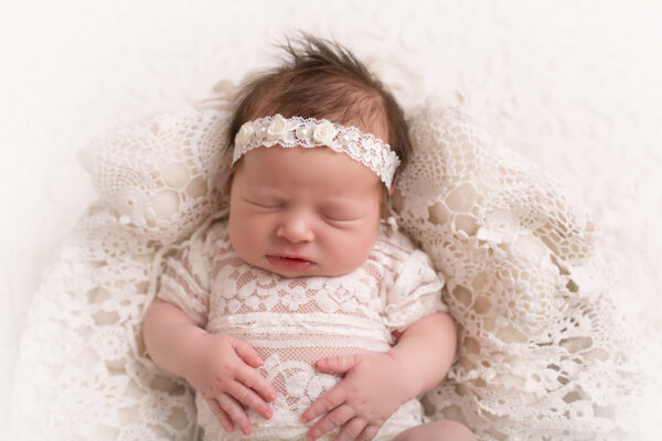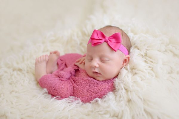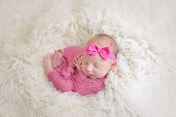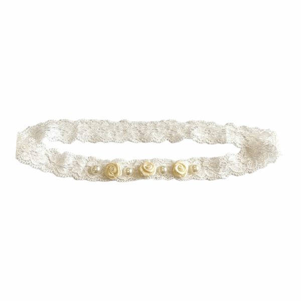 Three blush pink lace bows with pearls on a plush soft elastic headband